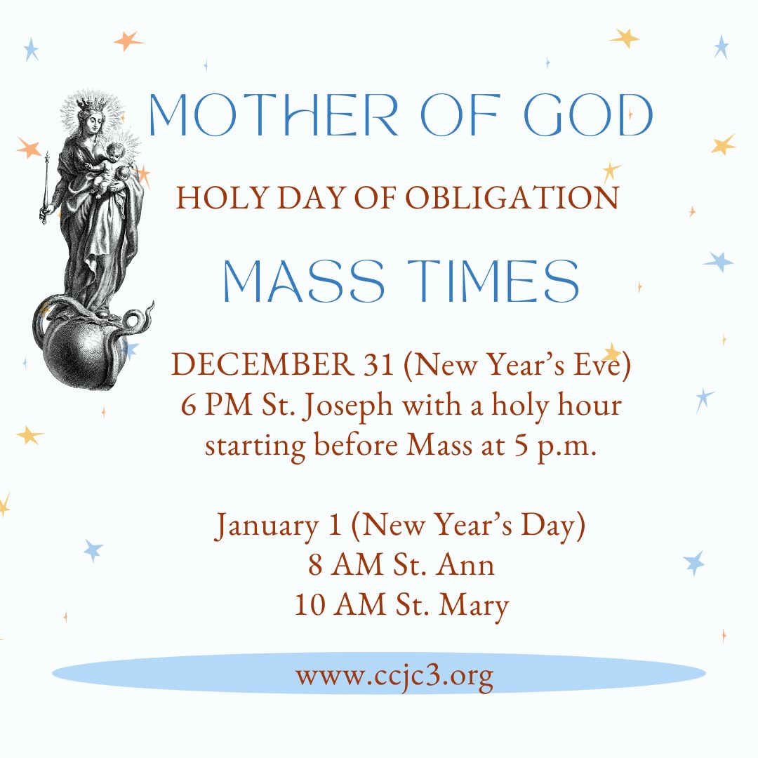 The Pastor's Corner Blog Celebrating all things Catholic. Inspiring Truth, Beauty & Goodness in our little corner of the world at the Catholic Community of Jennings County! General - 12/26/2025 Mother of God Mass//Holy Day of Obligation ...Read More General - 12/23/2025 Our New Pastoral Associate/ Director of Communications Dear Friends, Thank you for joining us on this the Feast of the Holy Family...Read More General - 12/02/2025 Immaculate Conception Masses//Holy Day of Obligation ...Read More General - 12/01/2025 Italy Pilgrimage with Fr. Chris this May! ...Read More General - 12/01/2025 Fr. Chris’ Letter for the First Sunday of Advent about Mass Time Changes! ...Read More General - 11/20/2025 Our Letter from Fr. Chris//Please Note the New Mass Changes! ...Read More General - 11/18/2025 Advent is Almost Here! There’s New Mass Times, Confessions, Christmas Mass Schedule & More! With the beginning of Advent, we will change some of our Mass Times at the...Read More General - 11/07/2025 Our Letter from Fr. Chris/Nov. 9 Weekend ...Read More General - 10/28/2025 Our Weekly Letter from Fr. Chris ...Read More General - 10/24/2025 Fr. Chris’ Letter for October 26 ...Read More