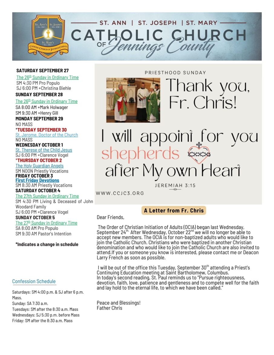 We celebrated St. Joseph’s 175th Anniversary with Archbishop Charles Thompson on Aug. 16. Fr. Chris Craig was also installed as the pastor of St. Joseph, St. Ann and St. Mary at this Mass by the archbishop. Deacon Larry French and Fr. Jonathan Meyer, former pastor, were also at the celebration, along with Benedictine Sister Joann Hunt who took up the … Read More