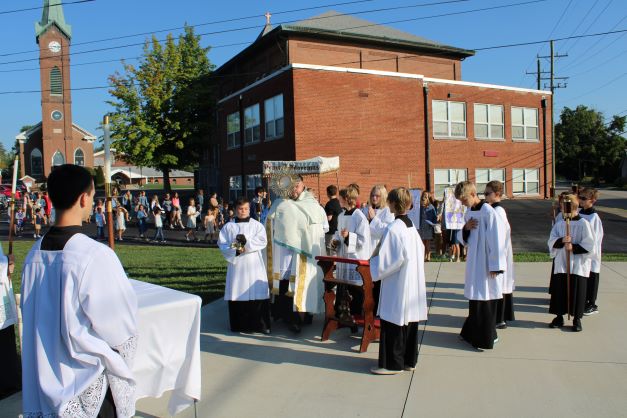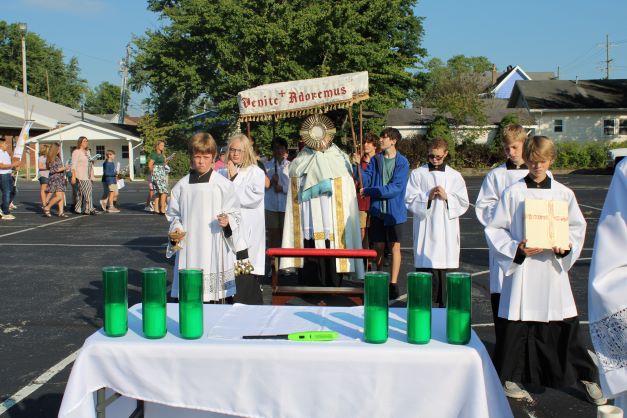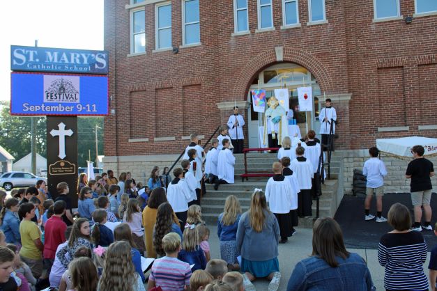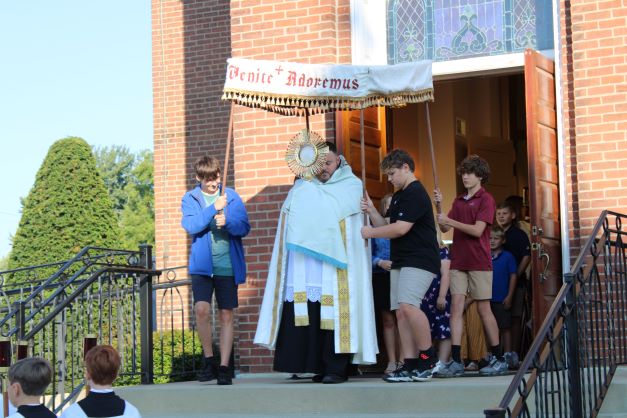 Father Jerry Byrd, pastor of the Catholic Community of Jennings County, led the students in the Eucharistic procession that stopped at three different altars on the school and parish grounds.
